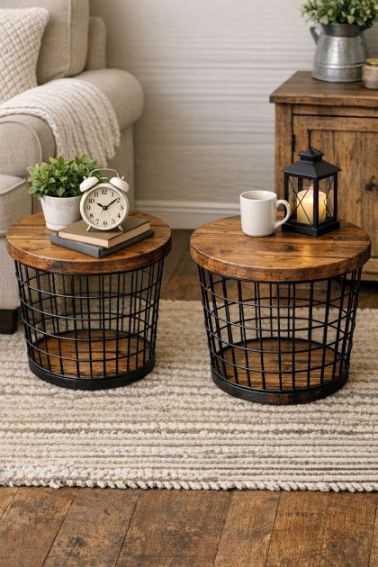 Farmhouse style has become a beloved trend in home decor, characterized by its rustic charm and blend of old-world warmth with modern aesthetics. This DIY farmhouse side table is a perfect project for those looking to add a touch of this style to their home. Combining simplicity with creativity, this project involves attaching black metal wire laundry baskets to stained pine wood rounds, creating a functional and stylish piece that is sure to impress guests and family alike. This hack is gaining popularity for its affordability, ease, and the unique twist it brings to any room.