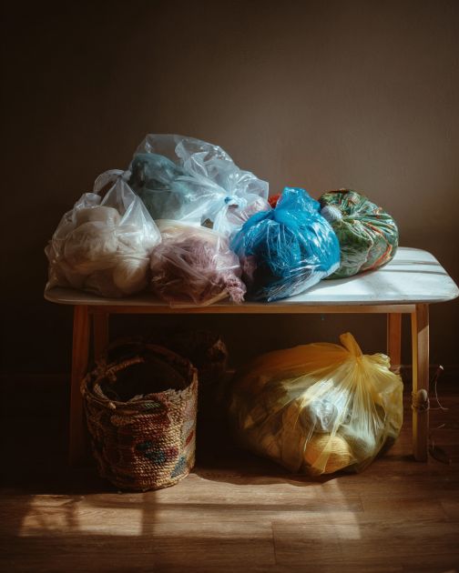 Collect and sort the plastic bags by color. Flatten each bag to remove any creases.
