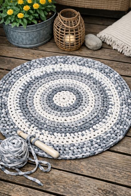 This DIY outdoor rug can add texture and interest to your patio or balcony. Pair it with neutral tones and natural materials like wood or rattan furniture for a cohesive look. The grey and white color scheme of the rug complements a variety of color palettes, making it a versatile piece that fits into both modern and rustic outdoor settings.