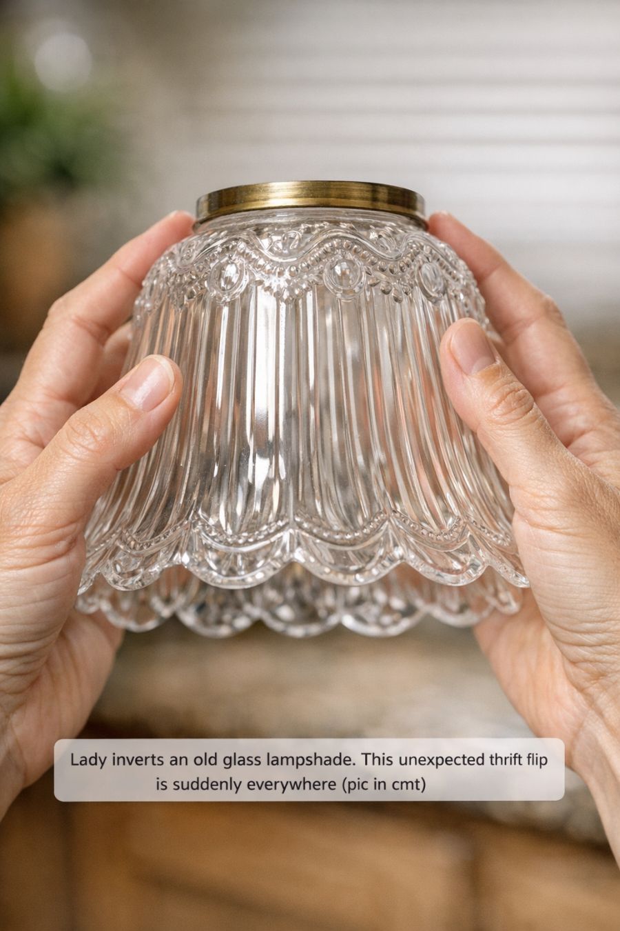 Lady inverts an old glass lampshade. This unexpected thrift flip is suddenly everywhere