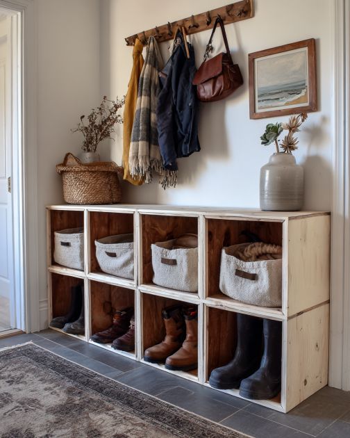 These DIY mudroom cubbies can be styled to complement any interior design theme. For a rustic look, you can leave the wood in its natural state, highlighting the grain and texture. If your home has a more modern aesthetic, consider painting the drawers in a sleek, monochromatic color scheme. Adding decorative hooks and labels can enhance functionality while aligning with your chosen style. Incorporating baskets or bins inside the cubbies can also add an extra layer of organization and style.