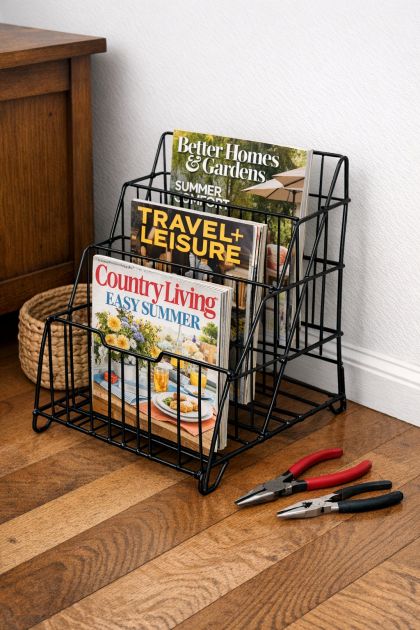 This DIY magazine rack can be a stylish addition to any modern or minimalist home. Its sleek and simple design works well in living rooms, home offices, or even bedrooms. You can place it beside a sofa or armchair for easy access to your favorite magazines or books. To enhance its appeal, consider painting the wire holder in a metallic finish such as gold or silver for a touch of elegance, or go for a matte black for a more contemporary look. Pair it with a cozy throw and some decorative pillows to create a cozy reading nook.