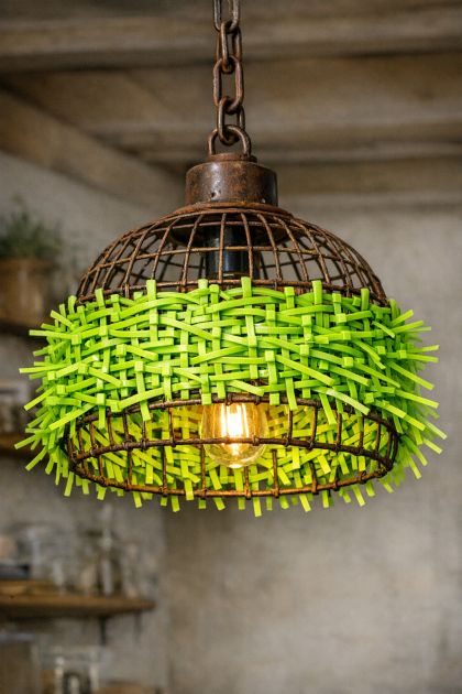 Transform an old wire basket into a stunning modern pendant light with a burst of neon color. This project not only upcycles a rusty basket but also adds a vibrant and unique touch to your home decor. With just a few simple materials, you can create a piece that is both artistic and functional. The use of neon green zip ties brings a contemporary twist to the rustic charm of the metal basket, making it an eye-catching centerpiece for any room.