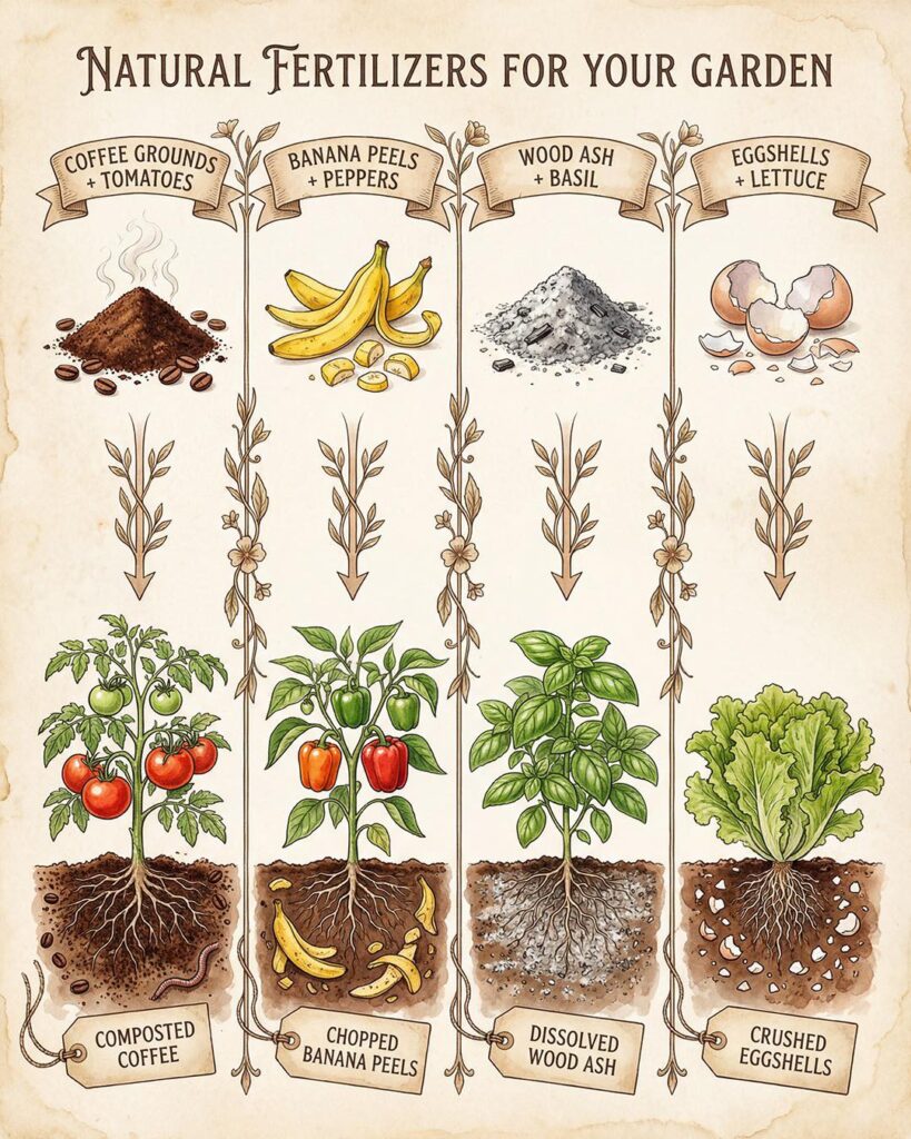 The best natural fertilizer system for a home garden is not built around one ingredient from the kitchen. It is built around compost as the foundation, mulch to protect and feed the soil, and targeted extras used with restraint. Coffee grounds, banana peels, wood ash, and eggshells can all be useful, but each one works best when matched to the right crop and used in the right amount. When you feed the soil first and the plant second, most vegetables and fruits reward you with healthier growth, better flavor, and a more productive garden season.