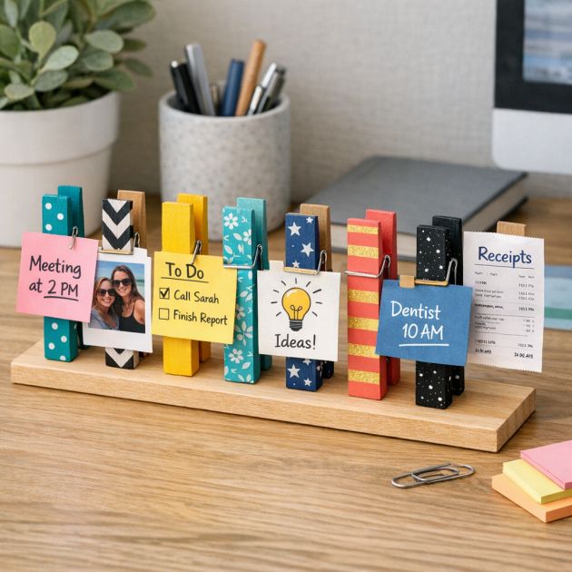 Organize your desk by using clothespins as holders for notes, photos, and small documents. Stand the clothespins upright and clip them to a wooden base or a strip of cardboard for stability.