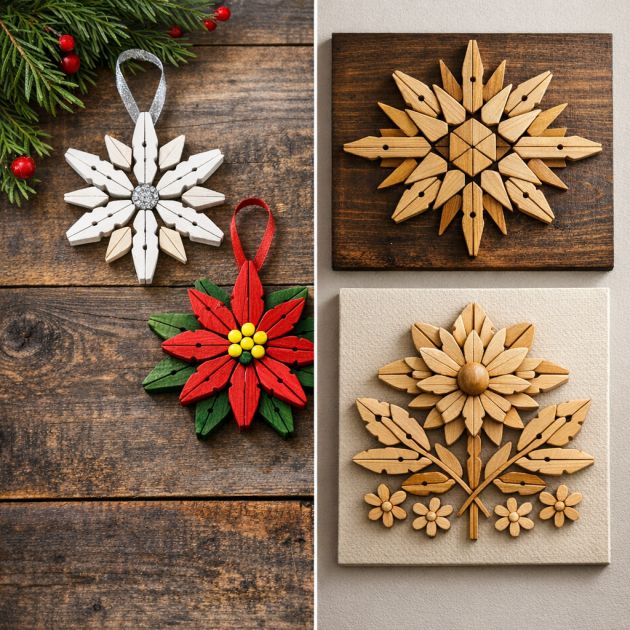Transform clothespins into beautiful home décor items by dismantling them and using the wooden pieces to create ornaments or wall art. Glue the pieces together in geometric patterns or floral designs on a canvas or wooden board.