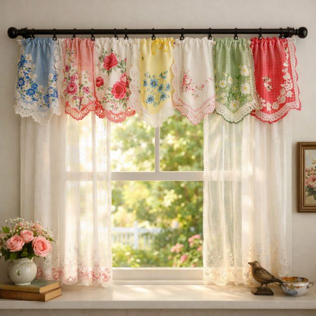 Add a touch of whimsy to your windows by using vintage handkerchiefs as curtain toppers or valances. Measure the width of your window and sew enough handkerchiefs together to fit across the top, allowing for a slight gather. Attach them to a curtain rod using curtain clips or sew a pocket along the top edge for the rod to slide through. The light filtering through the delicate fabric will create a charming effect in any room.