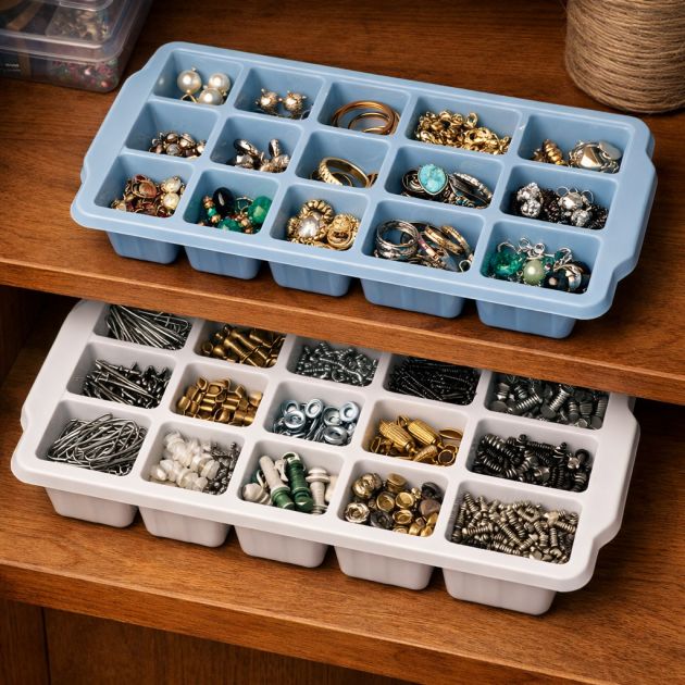 Ice cube trays can double as organizers for small items. Use them to separate and store jewelry, beads, or even small hardware like screws and nails. The individual compartments keep items from tangling or mixing, making it easy to find exactly what you need at a glance. You can stack the trays in a drawer or keep them on a shelf for easy access.