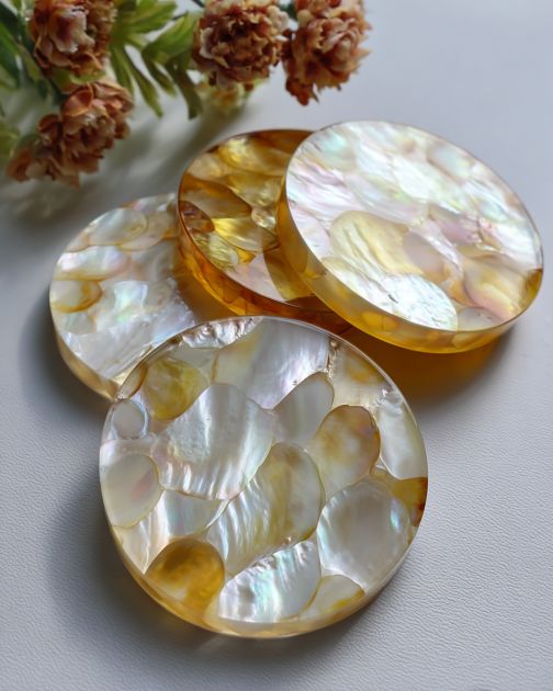 These crushed shell coasters can be styled as a centerpiece on a coastal-themed table setting or scattered throughout the home for a subtle nod to the ocean. Pair them with soft blues and sandy neutrals for a serene beach-inspired look. Consider using them to protect surfaces while adding a decorative element to your coffee table, dining table, or even as a thoughtful gift for ocean-loving friends.