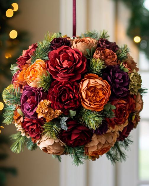 This floral styrofoam ball can be styled as a centerpiece on your porch table or hung from the ceiling as a festive ornament. Pair it with string lights and other natural elements like pinecones or greenery to create a cohesive and inviting look. Consider using a color palette that complements the exterior of your home or the theme of your holiday decorations.