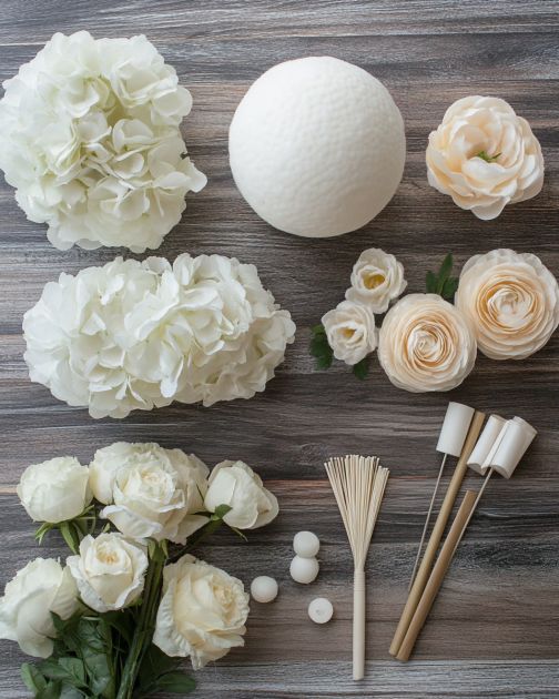 Begin by sorting your artificial flowers by size and color. This will help you plan the placement on the styrofoam ball.